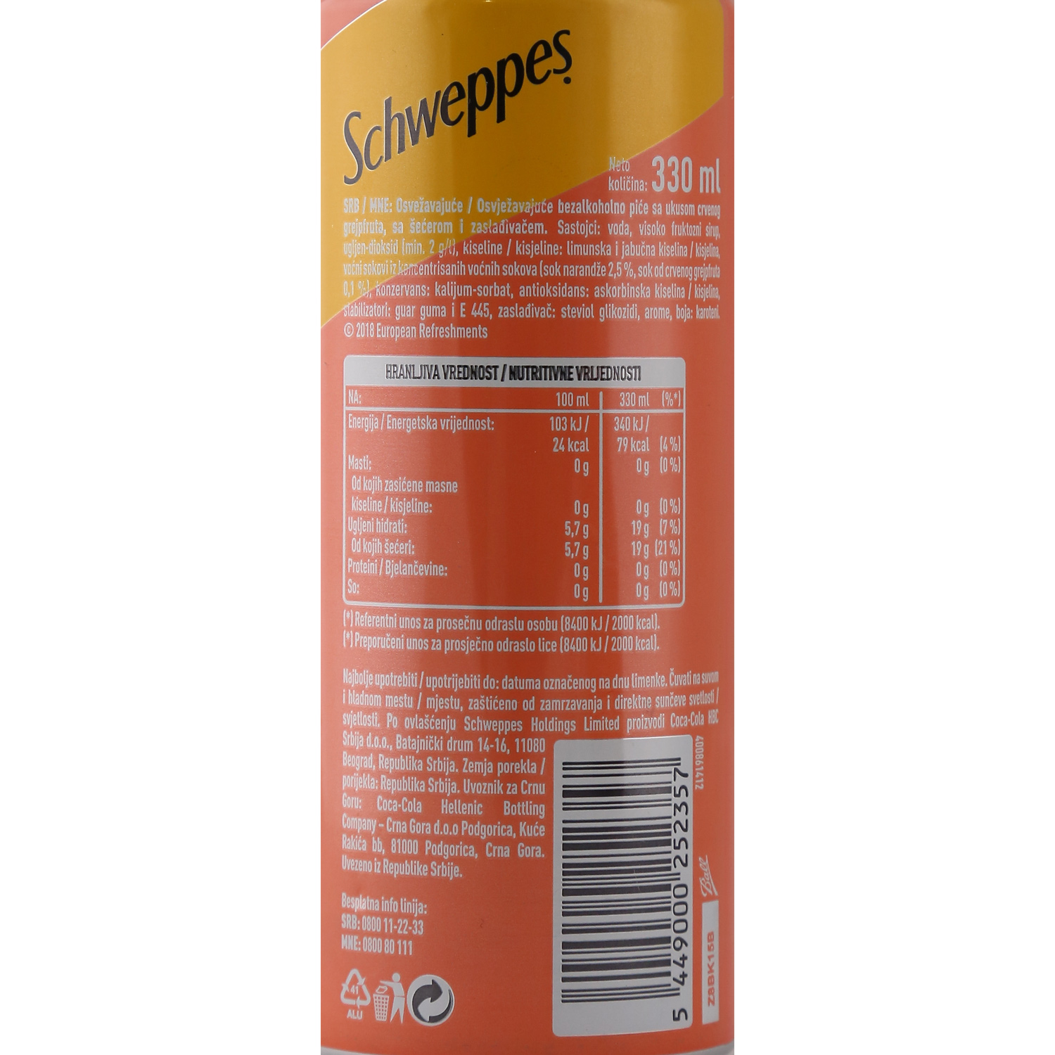 Osvježavajuće, bezalkoholno piće sa ukusom crvenog grejpfruta, sa šećerom i zaslađivačem