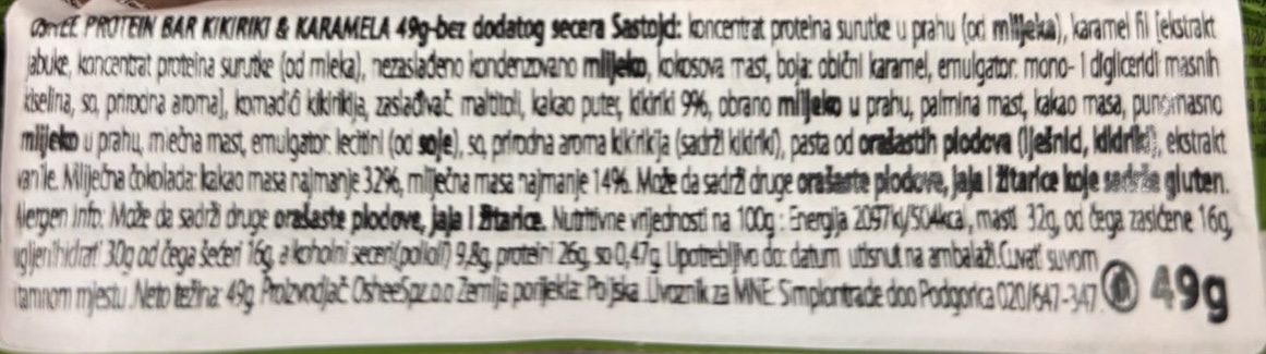 Sastojci koncentrat proteina surutke u prahu (od mlijeka), karamel fil [ekstrakt jabuke, koncentrat proteina surutke (od mleka), nezasladeno kondenzovano mlijeko, kokosova mast, boja:obicni karamel, emulgator: mono- i digliceridi masnih kiselina, so, prirodna aroma], komadic´i kikirikija,zasladivac: maltitoli, kakao puter, kikiriki 9%, obrano mlijeko u prahu, palmina mast, kakao masa, punomasno mlijeko u prahu,mlecna mast, emulgator: lecitini (od soje), so, prirodna aroma kikirikija (sadrži kikiriki), pasta od orašastih plodova (lješnici, kikiriki), ekstrakt vanile. Mlijecna cokolada:kakao masa najmanje 32%, mlijecna masa najmanje 14%.