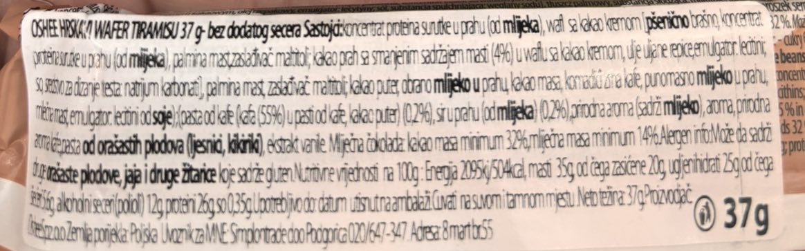 Sastojci koncentrat proteina surutke u prahu (od mlijeka), wafl sa kakao kremom [pšenicno brašno, koncentrat proteina surutke u prahu (od mlijeka), palmina mast,zasladivac: maltitoli; kakao prah sa smanjenim sadržajem masti (4%) u waflu sa kakao kremom, ulje uljane repice,emulgator: lecitini; so, sredstvo za dizanje testa: natrijum karbonati], palmina mast, zasladivac: maltitoli; kakao puter, obrano mlijeko u prahu, kakao masa, komadic´i zrna kafe, punomasno mlijeko u prahu, mlecna mast, emulgator: lecitini od soje);(pasta od kafe (kafa (55%) u pasti od kafe, kakao puter) (0,2%), sir u prahu (od mlijeka) (0,2%),prirodna aroma (sadrži mlijeko), aroma, prirodna aroma kafe,pasta od orašastih plodova (ljesnici, kikiriki), ekstrakt vanile. Mlijecna cokolada: kakao masa minimum 32%,mlijecna masa minimum 14%.