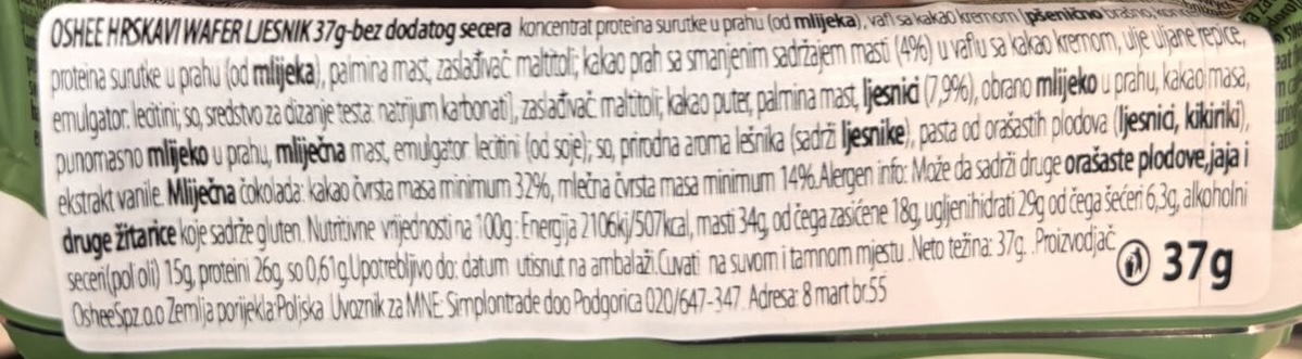Protein hrskavi wafer ljesnik 37g bez dodatog secera Oshee