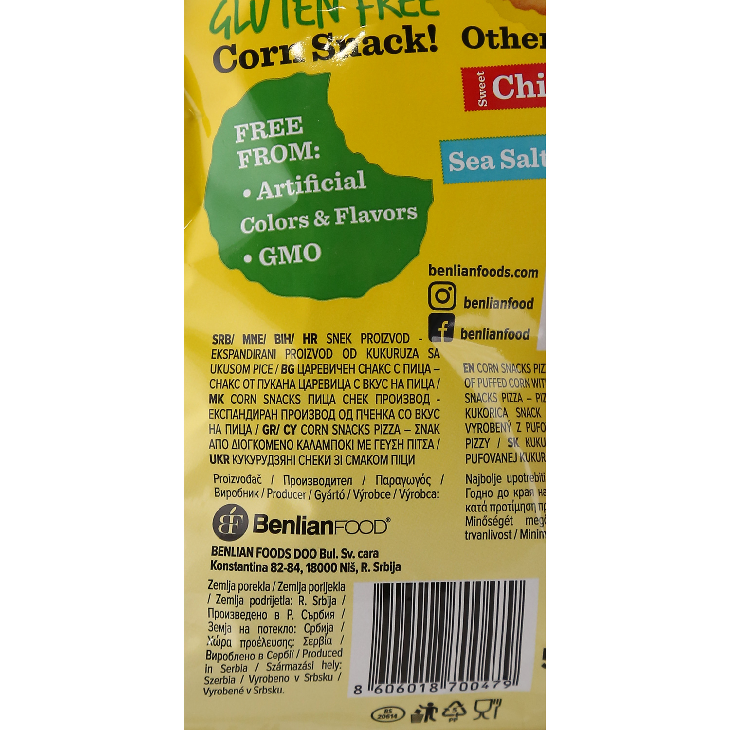 Sastojci Kukuruz 81%, suncokretovo ulje, smeša za aromatizovanje 5% (kuhinjska so, surutka u prahu, maltodextrin, šećer, pojačivači ukusa (natrijum glutaminat, dinatrijum inozinat, natrijum guanilat), paradajz 6%, sir 4%, origano 2,5%, luk, začinsko bilje, sredstvo protiv zgrudnjavanja (silicijum- dioksid), boje (ekstrakt paprike, kapsantin, anato ekstrakt), regulator kiselosti (natrijum-fosfat), himalajska so 2%.