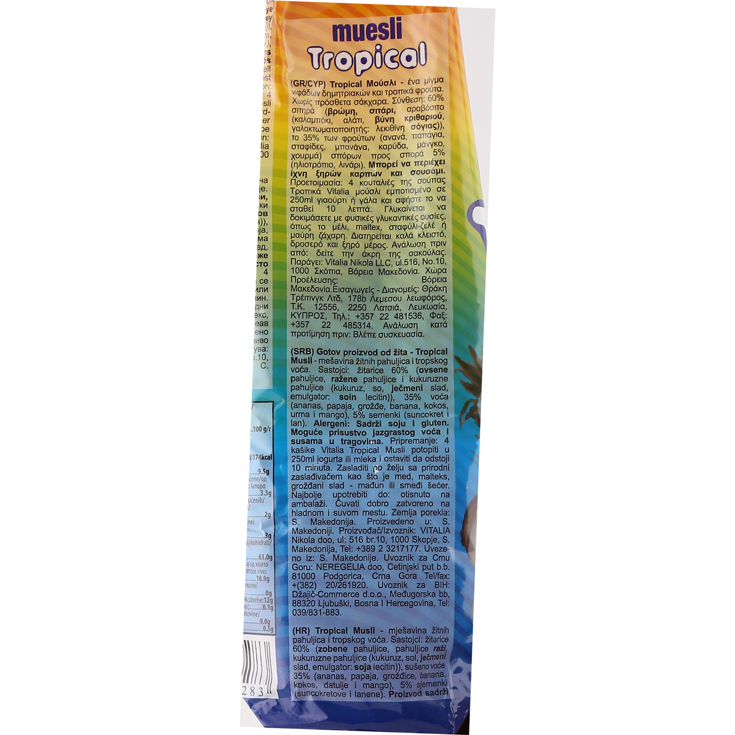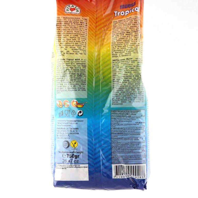 Sastojci Žitarice 60% (ovsene pahuljice, ražene pahuljice i kukuruzne pahuljice (kukurus, so, ječmeni slad, emulgator: sojin lecitin)), 35% voća (ananas, papaja, grozđe, banana, kokos, urma i mango), 5% sjemenki (suncokret i lan).