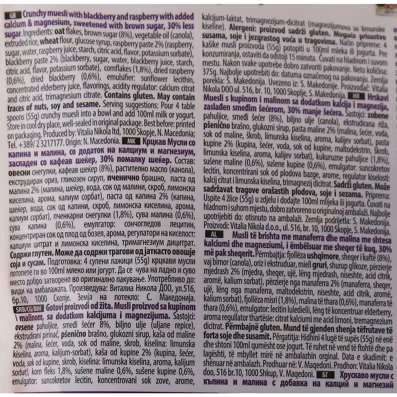Sastojci Ovsene pahuljice, smeđi šećer 8%, biljno ulje (uljane repice), ekstrudirani pirinač, pšenično brašno, glukozni sirup, kaša od maline 2% (malina, šećer, voda, sok od maline, skrob, kiselina: limunska kiselina, aroma, kalijum-sorbat), kaša od kupine 2% (kupina, šećer, voda, sok od kupine, skrob, kiselina: limunska kiselina, aroma, kalijum sorbat), korn fleks 1.8%, sušene maline 0.6%, sušene kupine 0.6%, emulgator: suncokretov lecitin, koncetrovani sok zove, arome, kalcijum-laktat, trimagnezijum-dicitrat (magnezijumova so limunske kiseline)