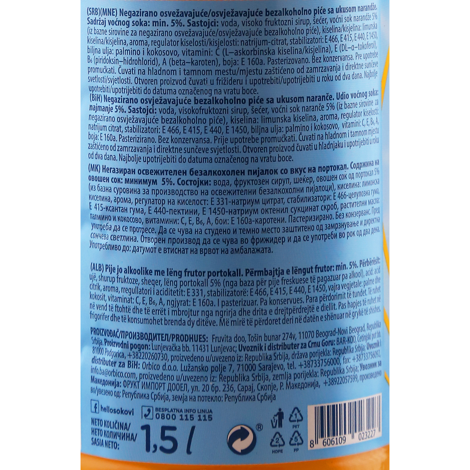 Sastojci Voda, voćni sok narandže 10% (iz bazne sirovine za negazirano osvežavajuće bezalkoholno piće), visoko fruktozni sirup, šećer, kiselina: limunska kiselina, ekstakt narandže, aroma, antioksidans: L-askorbinska kiselina,stabilizatori: E414, E412, E445, boja: E160a.