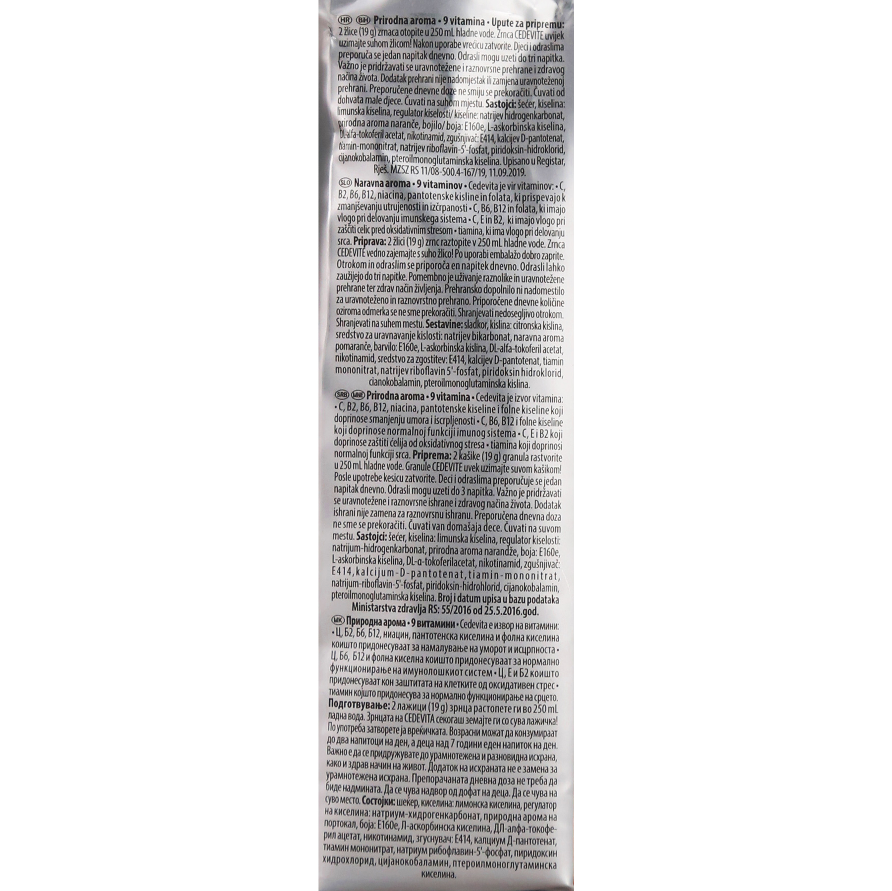 Sastojci Šecer, kisjelina: limunska kisjelina, regulator kisjelosti: natrijum hidrogen karbonat, prirodna aroma narandže, boja: E160e, L-askorbinska kisjelina, DL-alfa-tokoferil acetat, nikotinamid, zgušnjivac: E 414, kalcijum -D-pantotenat, tiamin-mononitrat, natrijum riboflavin-5'-fosfat, piridoksin-hidroklorid, cijanokobalamin, pteroilmonoglutaminska kisjelina.