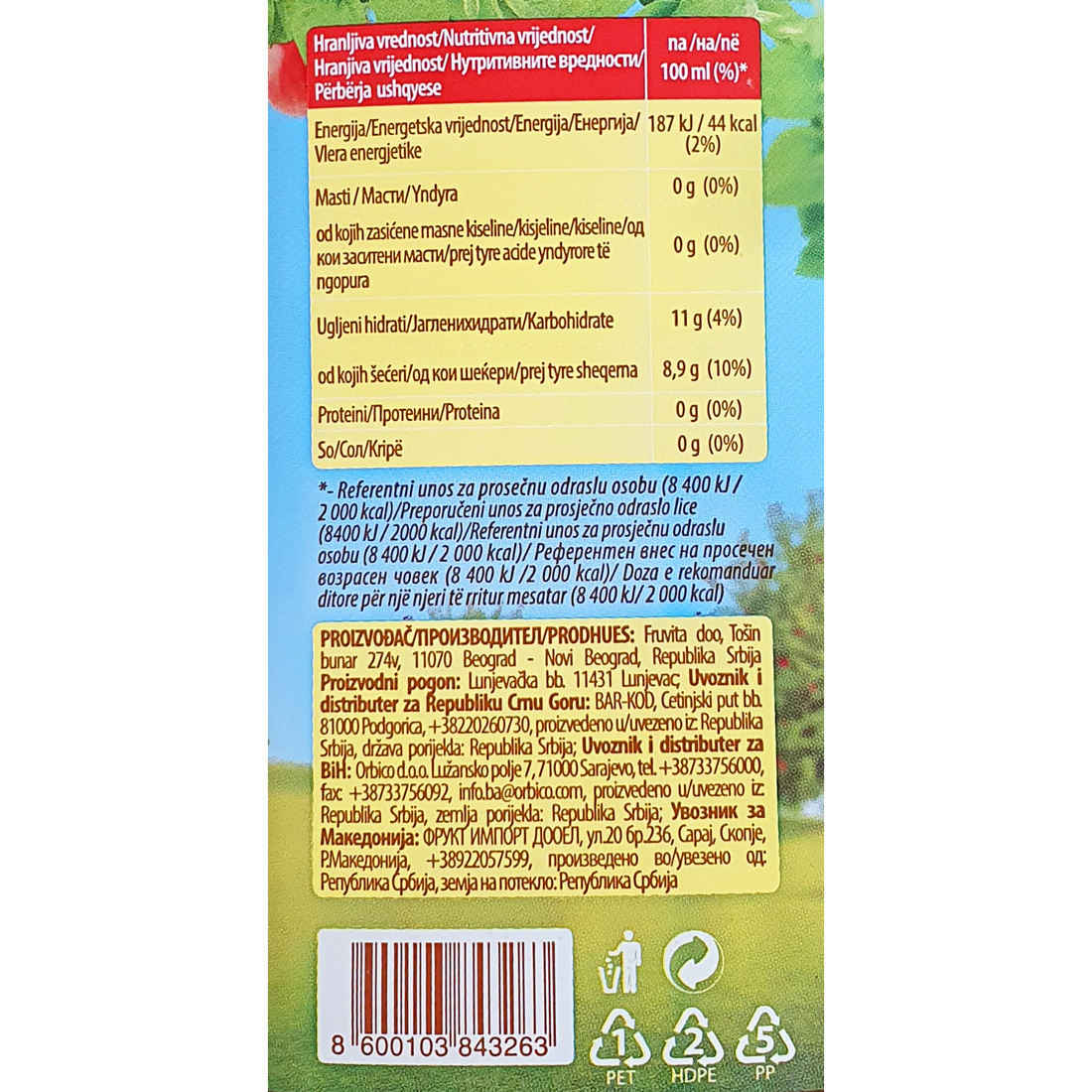 Sastojci Voda, kaša breskve (voćni sok breskve 17%), kaša jabuke (voćni sok jabuke 10%), visoko fruktozni sirup, šećer, kisjelina: limunska kisjelina, regulator kisjelosti: natrijum-citrat, stabilizator: pektini, antioksidans: L-askorbinska kiselina, aroma.