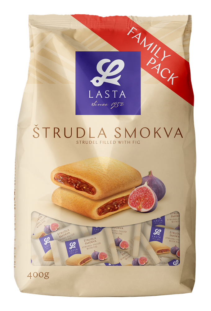 Sastojci Punjenje od smokve (glukozno fruktozni sirup, suha smokva 30%, voda, jabuka 3%, šećer, zgušnjivač pektin sa Na-alginatom, regulator kiselosti: limunska kiselina i Ca-citrat), pšenično brašno, voda, biljna mast (palmina mast), šećer, glukozni sirup, pšenični škrob, mliječna mast, jaja 0,4%, punomasno mlijeko u prahu 0,3%, obrano mlijeko u prahu 0,3%, prirodna aroma, tvari za rahljenje: amonijev hidrogenkarbonat, natrijev hidrogenkarbonat.